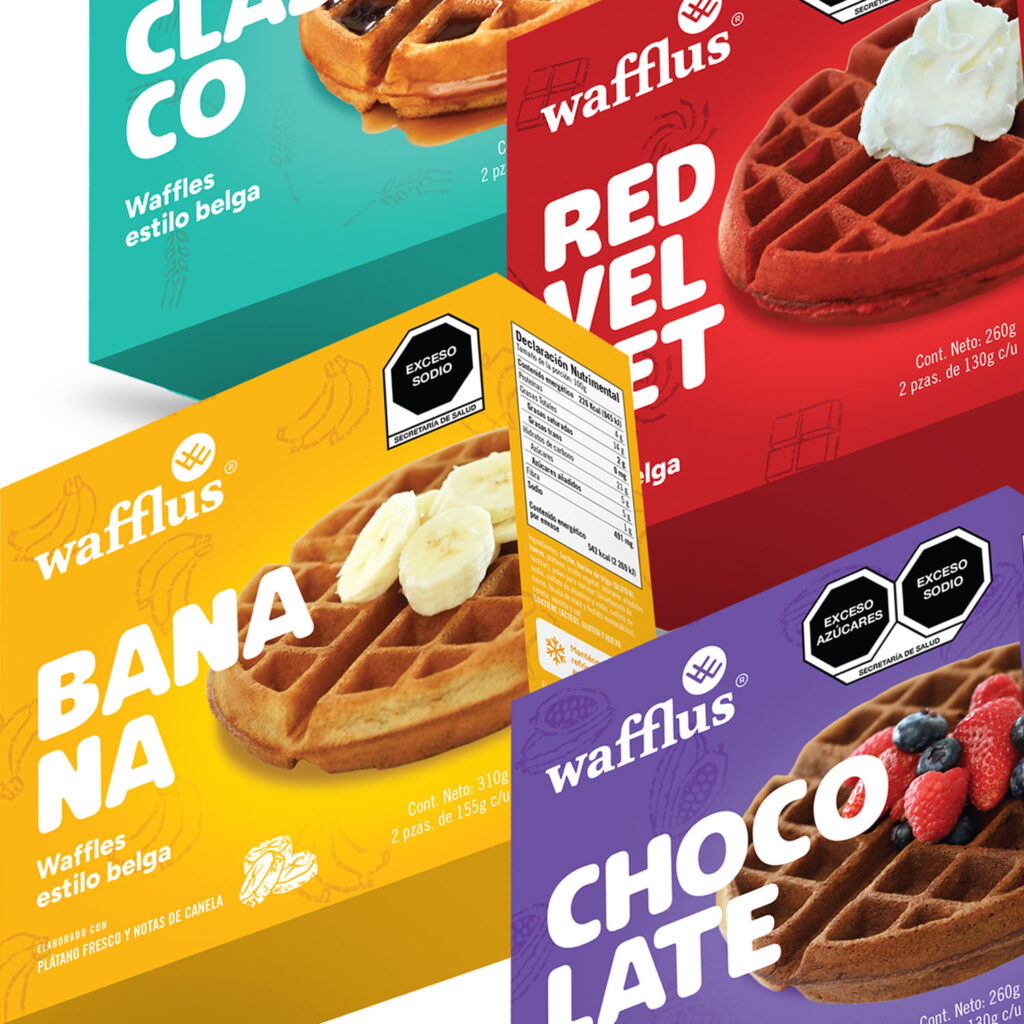 Diseño de empaque para waffles congelados, una colorida y divertida historia de sabores.