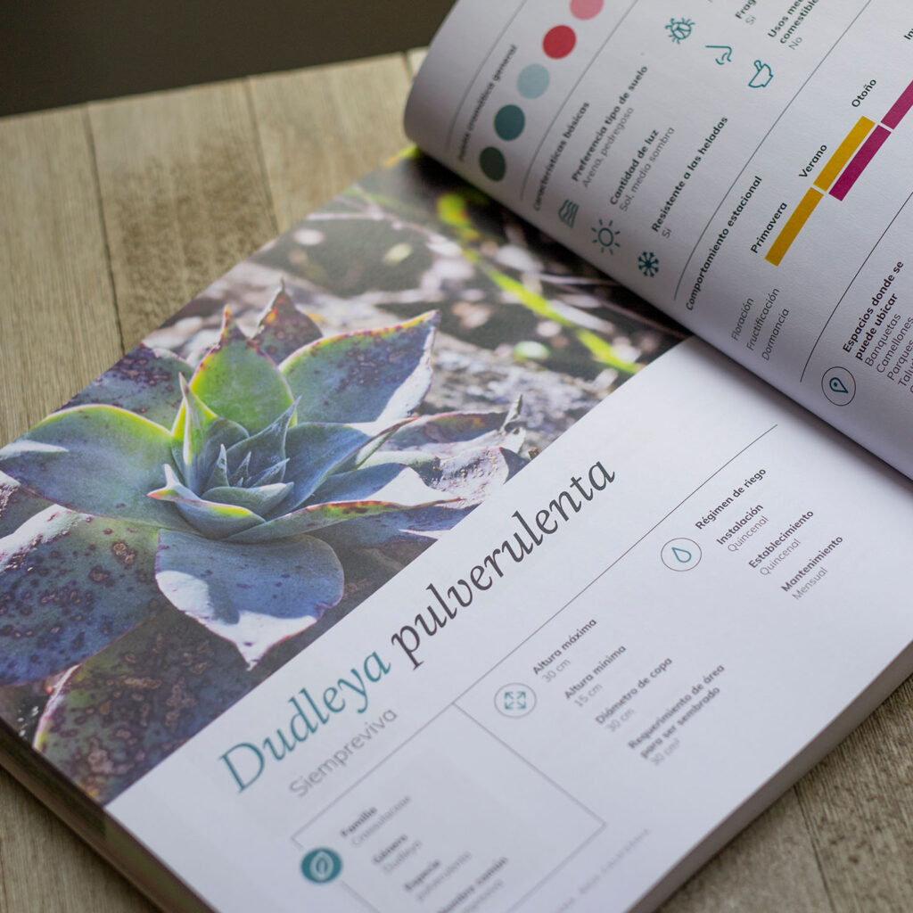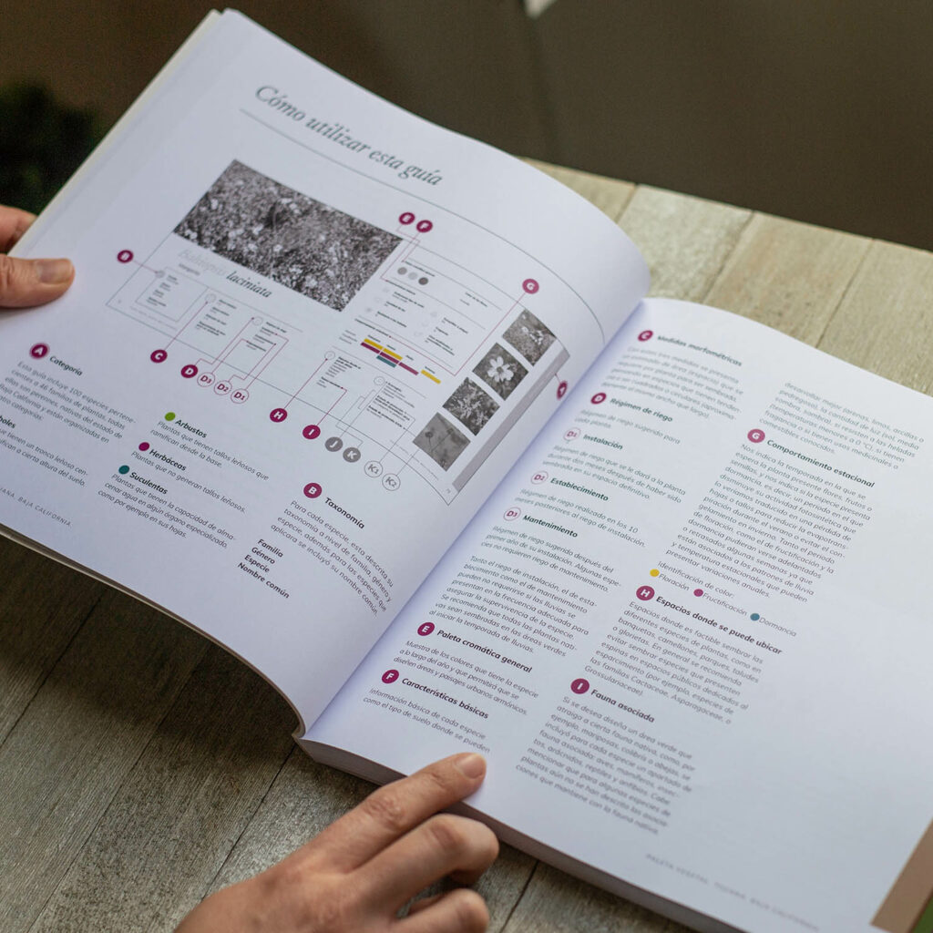 La organización de la información en sus más de 100 especies de plantas nativas incluidas llevó el objetivo de una amigable navegación tanto para expertos como aficionados en la materia. Creando un lenguaje de símbolos, color, tipografía y espacios que hicieran fácil de comprender y extraer lo que los usuarios requieran al abrir las primeras páginas.